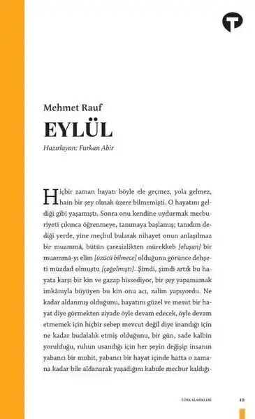 Türk edebiyatının ilk psikolojik romanı Eylül, evli bir kadın olan Suat’la Necip’in imkânsız aşkını konu edinir. Servet-i Fünun’un önde gelen yazarlarından Mehmet Rauf, mekânları ve mevsimleri de birer karaktere dönüştürüyor ve okuru sevgi sadakat, insan doğa, kadın erkek ilişkilerine dair sorular sormaya davet ediyor.