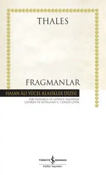Thales (MÖ y. 650/639-548/544): Yunan matematikçi, filozof, astronom. Batı Anadolu’daki Miletos’ta yaşamış olan Thales, her şeyin kaynağının su olduğunu söylemiş, var oluşu mitolojiye değil, doğadaki bir unsura dayandırmasıyla sadece felsefenin değil, doğa araştırmalarının ve bilimin de öncüsü olmuştur. Antikçağ felsefe ve düşünce tarihinin önemli figürleri sayılan Yedi Bilge’den biridir. Gökbilim ve mühendislik alanındaki çalışmalarıyla dikkat çeken Thales, yaşadığı dönemin kanaat önderleri arasında da gösterilir. Diğer Presokratik filozoflar gibi, Thales’in eserleri de günümüze ulaşmamıştır. Kendisiyle ve düşünceleriyle ilgili bilgiler sonraki yazar ve filozofların eserlerinde bulunur. Fragmanlar çalışması filolojik ve akademik açıdan saygın fragman derlemelerinin rehberliğinde Thales’in biyografisi, doktrini ve alımlanmasıyla ilgili fragmanların çevirisini ve kapsamlı açıklamalarını içermektedir.